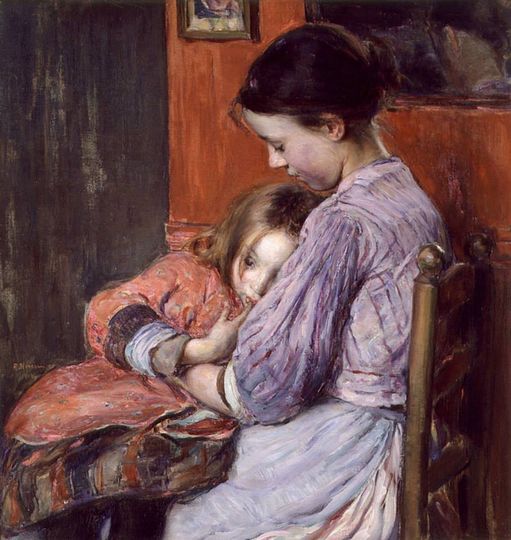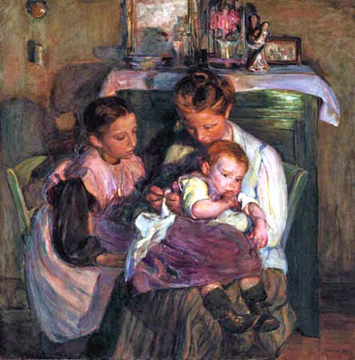 I suoi dipinti presentano spesso la luce grigia diffusa e le forme senza ombre degli artisti influenzati da Bastien-Lepage.